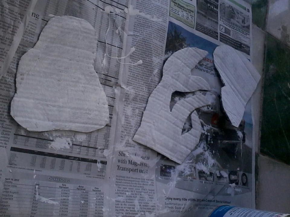 - Then we cover the white box with dark and light blue crepe paper and crumpled it for an effect. Then put the tail on. Wrap with green fabric and filled in with cotton. As you see in the pictures above, that's my 2 boys. We tried to take a picture on it and My brother bought a red wig for a props and a torch that we made out of a stick and cellophane.